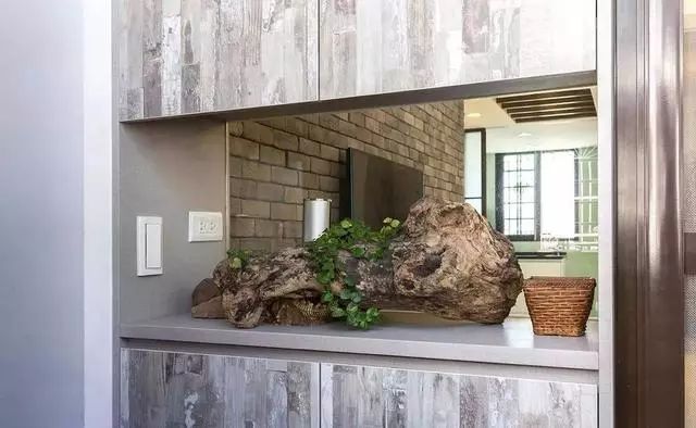 玄关柜中间的端景区摆上了一块装饰木摆件,以透明玻璃作为背景,将家中之景尽收眼底。