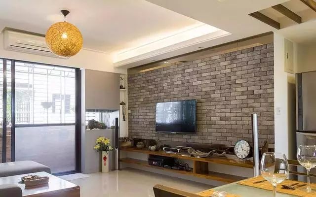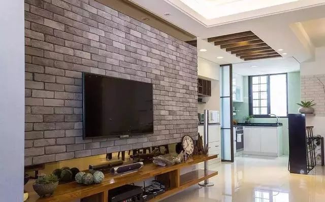 电视背景墙以文化石铺设,上下贴上茶镜延伸视觉。
