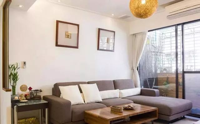 从落地窗一窥阳台的花园之景,室内以竹编吊灯、木制茶几、简约挂画等装饰,内外的自然元素相互呼应。