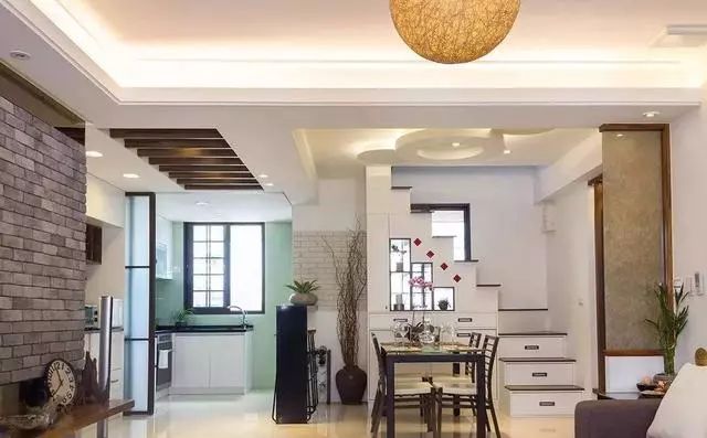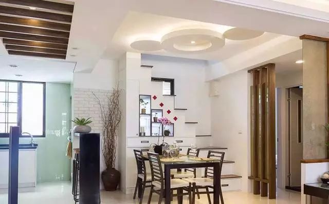 出入口对应的吊顶以木条打造栅格图案,而餐厅则以圆形异形吊顶作为造型,象征团圆。