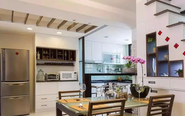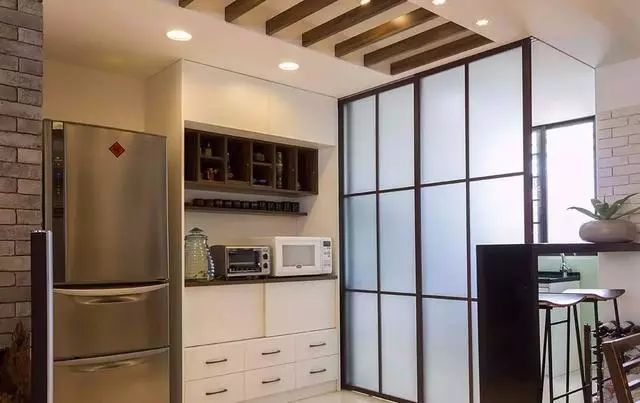 厨房出入口的玻璃推拉门,将它打造成一个相对独立的空间,隔绝重油烟。