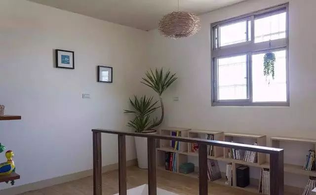 来到二楼,一上来就看到窗台下用木隔板打造了小书房,给孩子轻松愉悦的氛围。
