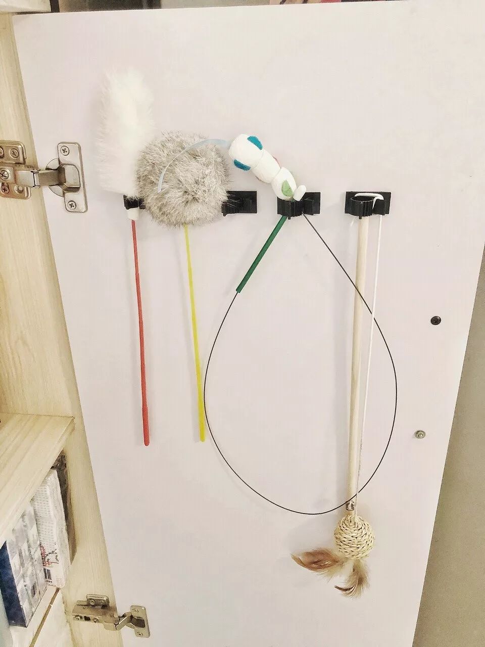逗猫棒之类的,我用电线收纳扣收纳在柜门后。
