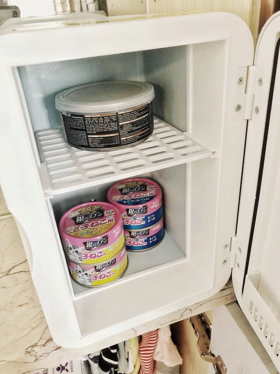 开封之后的猫罐头要冷藏,我准备了一个6L的迷你冰箱。