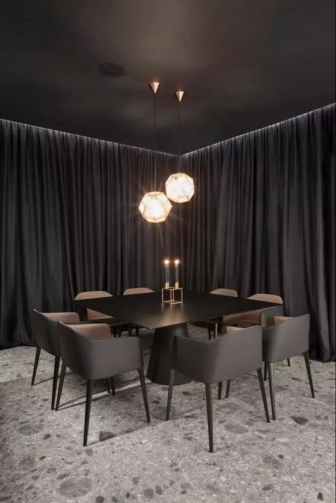 黑色的餐桌椅与深色天花板、窗帘融合