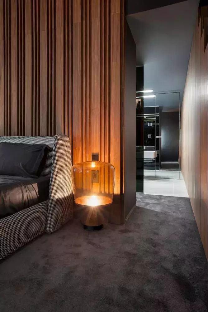 床头背景墙用竖条木材装饰