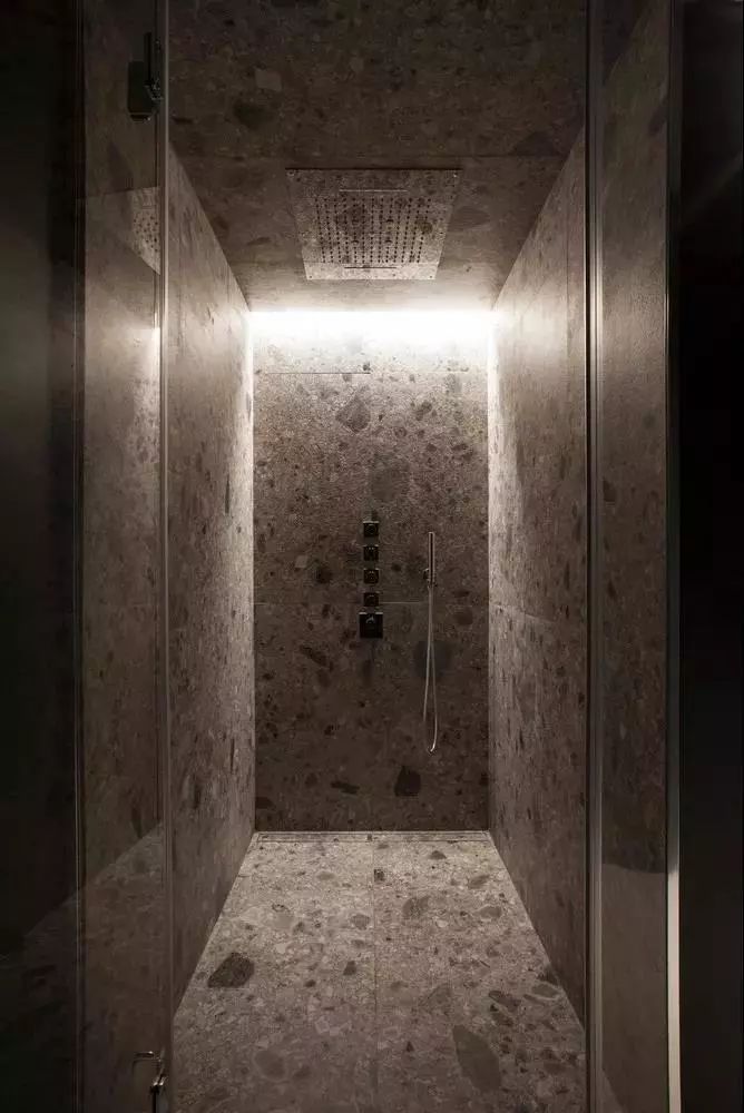 淋浴区四周利用水磨石贴面
