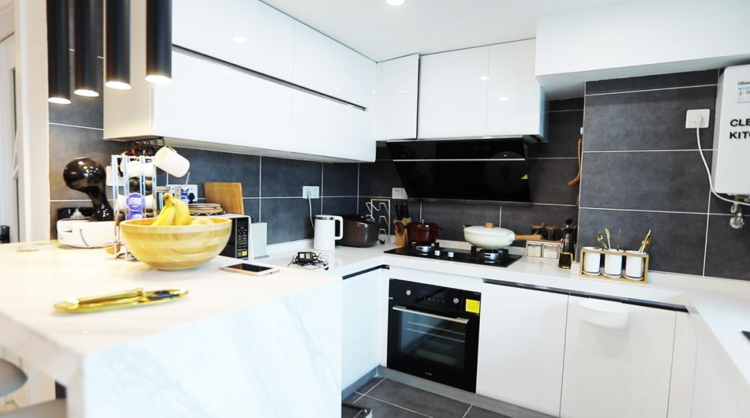 半开放式的厨房位于阳台的旁边,纯纯的白色,想想在阳光满溢的一天,连做饭都变得美美哒。