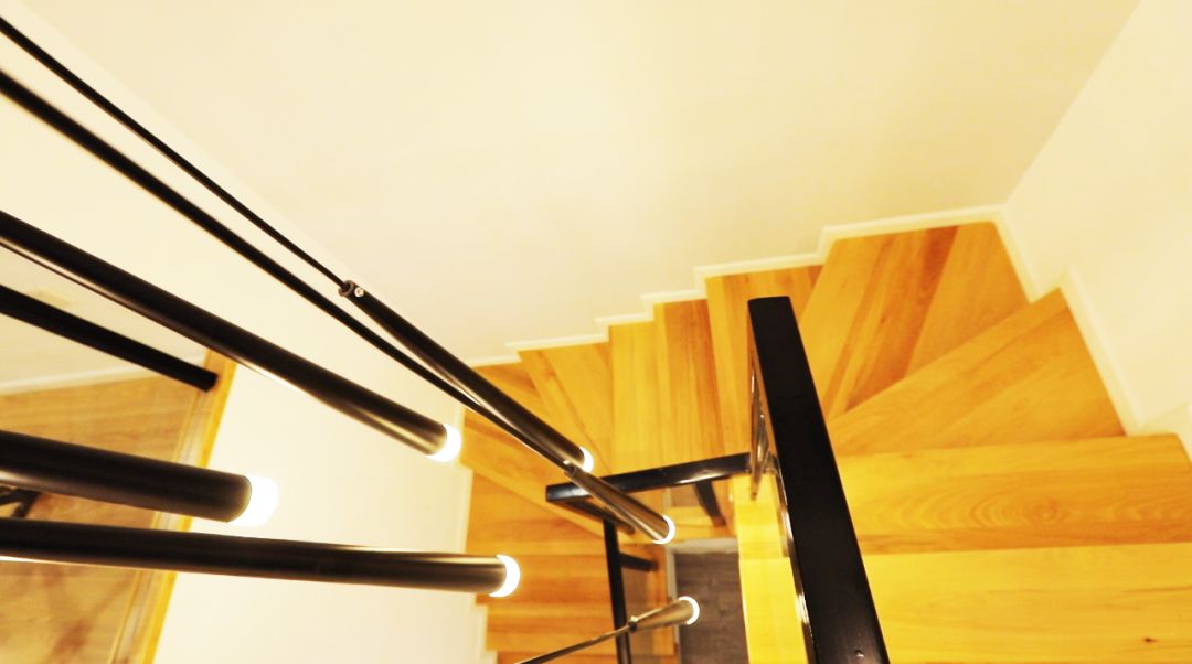 通过回型楼梯,是苜蓿家的二楼,会发现从楼梯开始,就已经和一层有了明显的区别,一层整屋使用了灰色系的地板,整体也是黑白灰配木色的利落舒适模样,而从楼梯到二楼,都使用了暖黄色的地板,让人觉得格外温暖放松。
