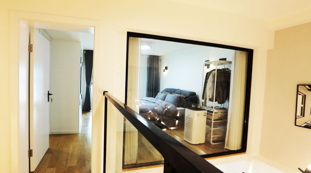 LOFT 虽好,但苜蓿的房子最初也有「尴尬」,就是位于房子较高位置,不可挪动拆卸的横梁,因为横梁的存在,所以二楼的房间划分,很大一部分设计,都是为了更好的隐藏横梁,比如客厅的墙面,就是隐藏了一处横梁,同时苜蓿还把这面墙上做了个玻璃窗,也是为了增加房间的通透感。