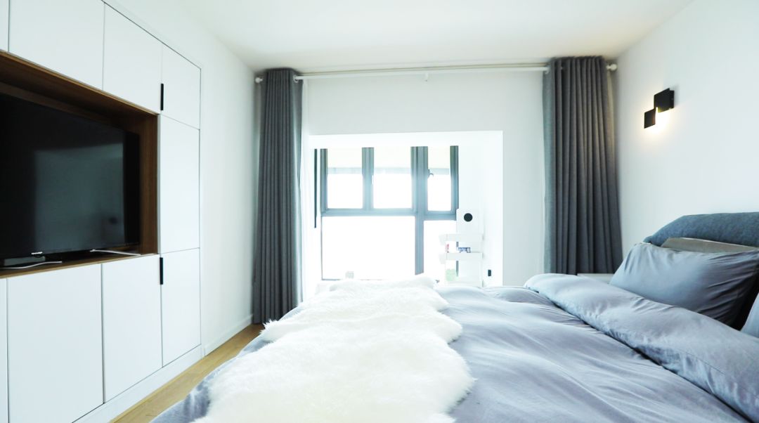 在苜蓿家的卧室,藏了两个小心思的存在,一处是卧室里的电视墙柜,除了给房间增加更多收纳空间,也是为了隐藏不可挪动的横梁。