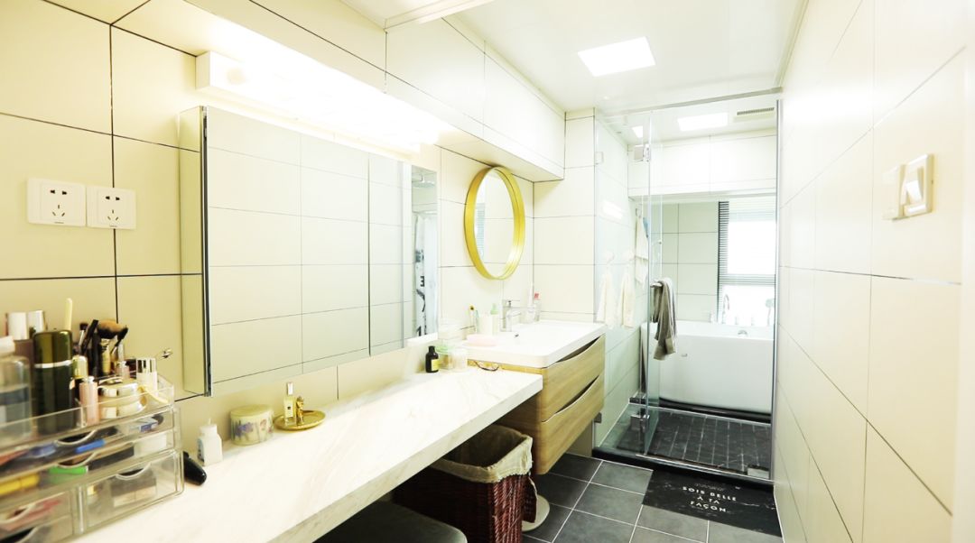 另一处,就是卧室中的卫生间,走进卫生间,先是一条「秘密通道」,洗手台、梳妆台,一应俱全。