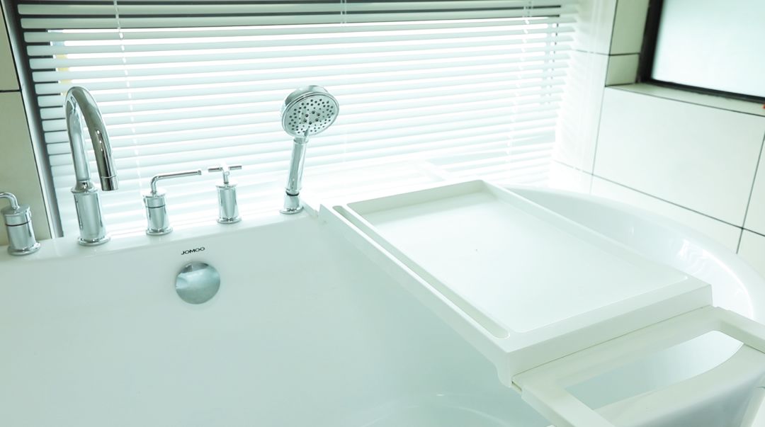 穿过这条通道,干湿分离的洗浴区内,放了一张舒适的大浴缸,浴缸旁,是一扇百叶窗,想想宁静的晚上,泡着泡泡浴,一杯红酒,还有窗外的霓虹夜景,这才是最美好的生活吧。