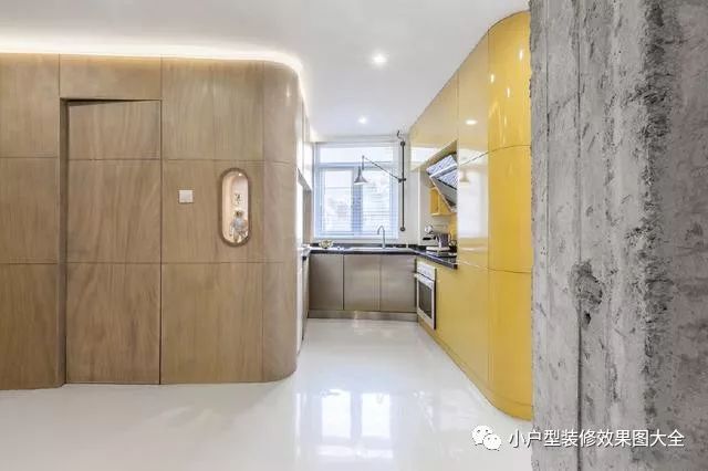 黄色的一个超级大的箱子状的隔断独立出一个小小的厨房,黄色的颜色显得清新,更加修饰了整个房间的色调。