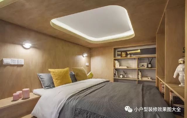 整体的浅棕色的木制家具,散发着暖暖的灯光的小灯具,灰色的床单,加上价格黄色的抱枕,整个卧室的空间虽然小,但是却处处透露着它的温馨。
