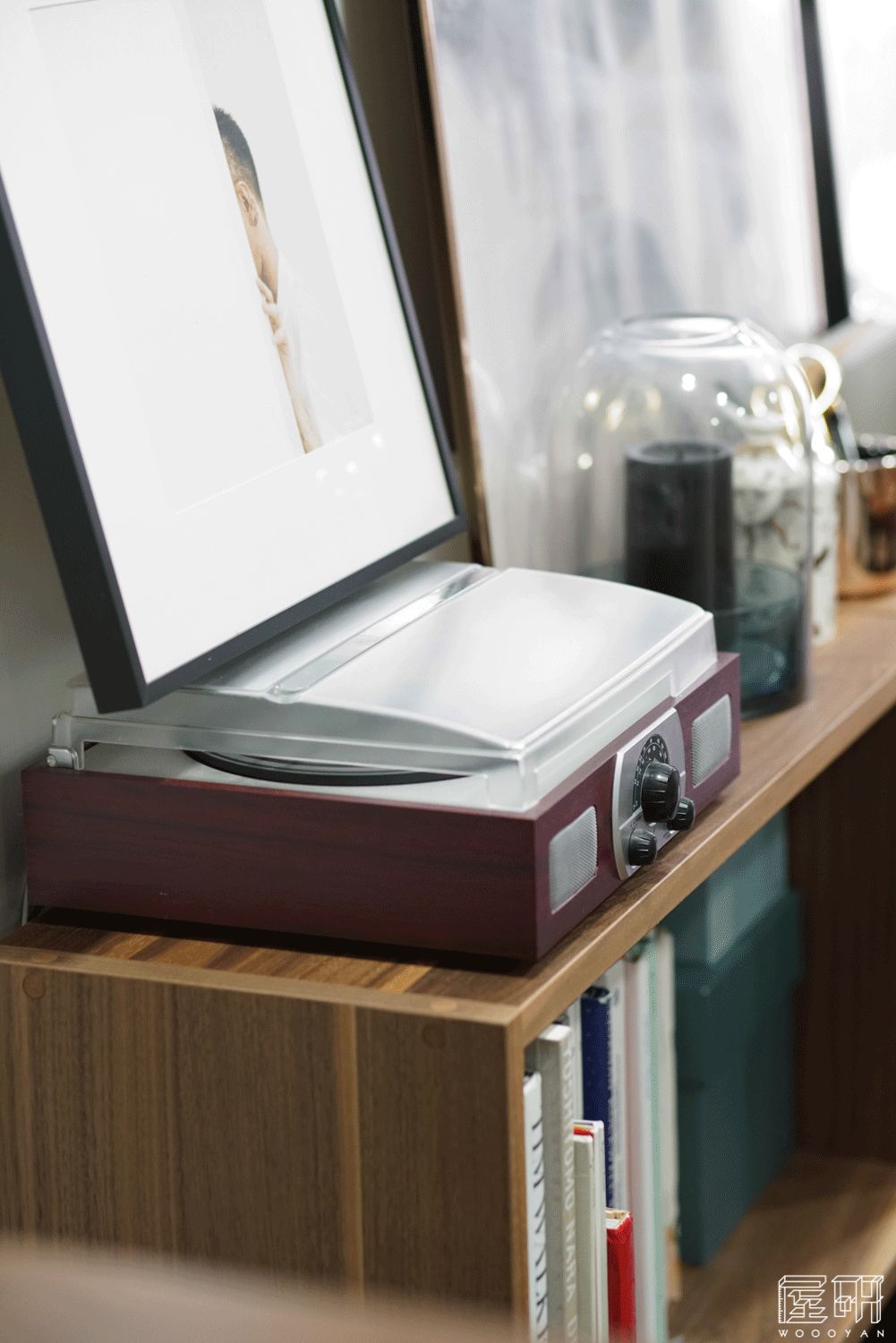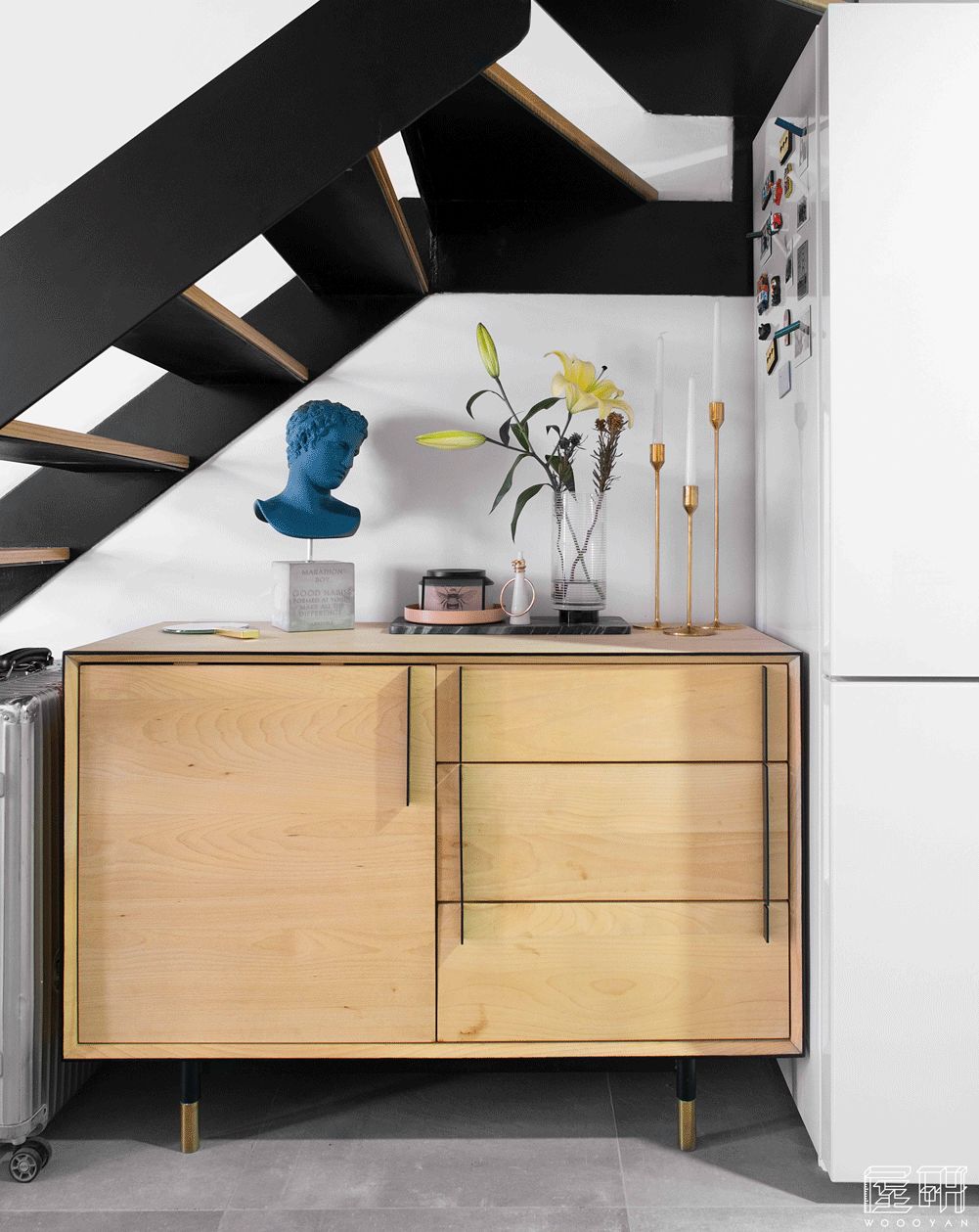 楼梯下的这个小柜子上也是布置得精致好看。Fredie家其实用了有不少的柜子,这里有他的巧思在里面。柜子本身有储物功能,上面也可以摆东西做置景。不同柜子之间的组合也会带来各种变化。