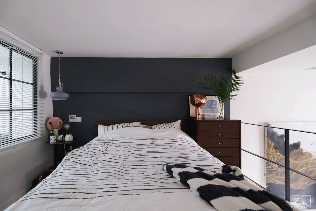 卧室的背景墙漆成了深灰色,配上一盏造型别致的吊灯,整个的氛围非常沉静。床选的也是简洁的款式,用satie的小边几做床头柜,上面放着精心挑选的花瓶和台灯,别致又不落俗套。