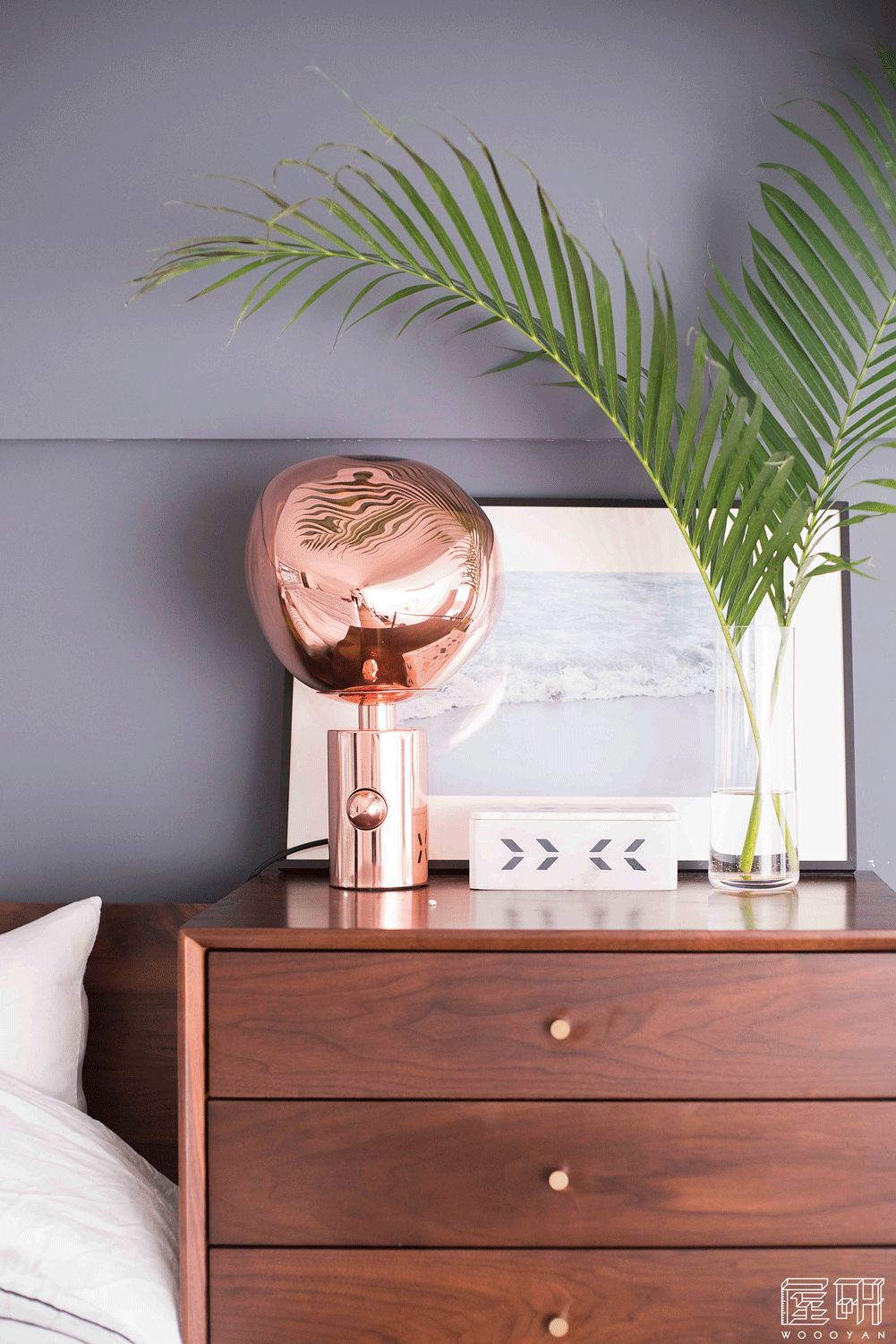床脚的角落里摆放黄铜的小茶几和杂志架,自然形成一处赏心悦目的置景。