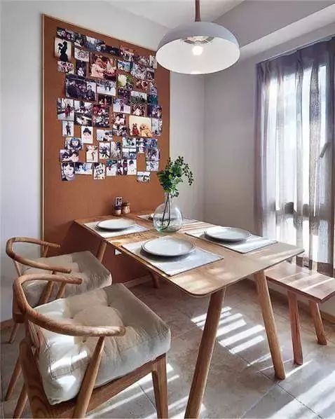 在餐厅,用软木板装饰餐厅墙面,上面贴满照片,每天吃饭都将是幸福感爆棚的时刻。