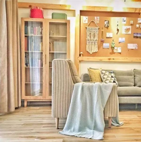在客厅,软木板和家里其他原木元素呼应,深浅不一的木色令整个空间更有层次感。