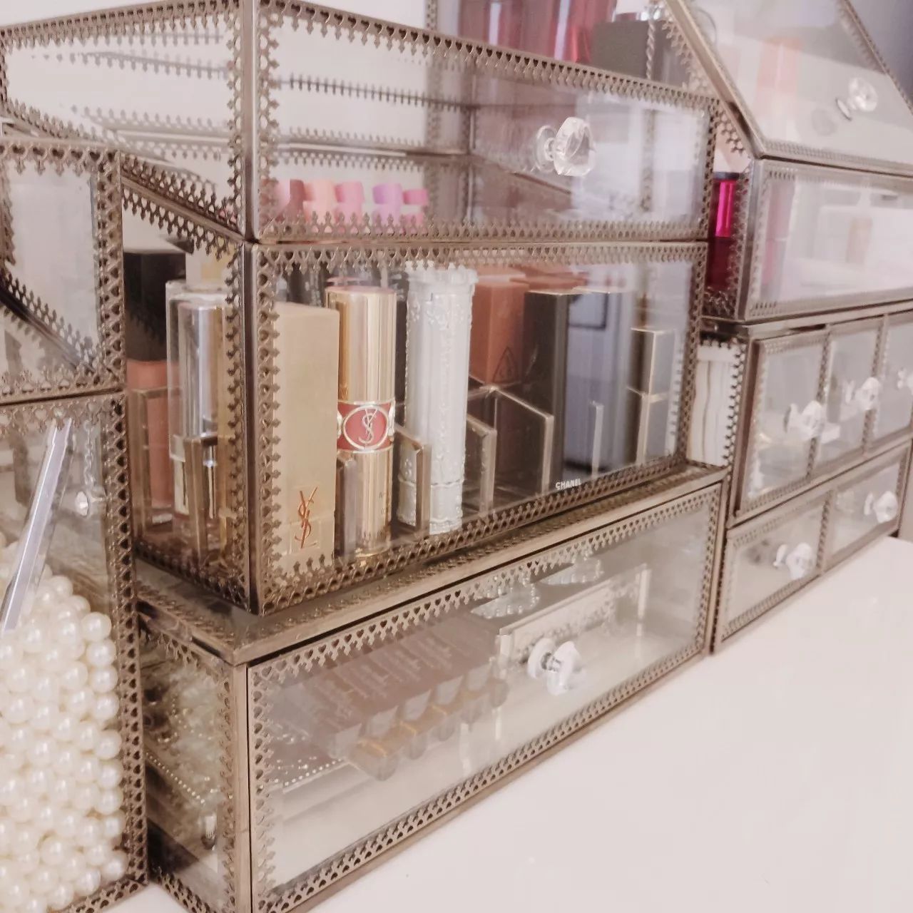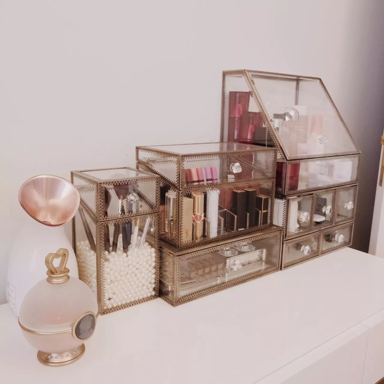 虽然之前用亚克力收纳化妆品也挺好,但是这款玻璃收纳盒的颜值实在是打动我,而且还和我家的化妆台很搭调。