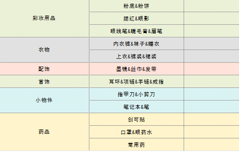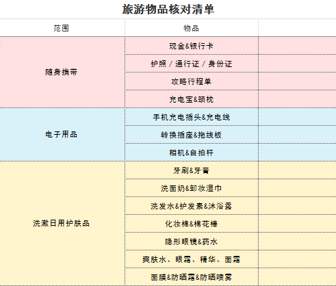 列出旅行要带的所有东西,分为这几类:随身物品、电子产品、洗漱护肤用品、化妆用品、衣物、药物、首饰、配饰等等。