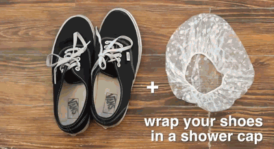 鞋子有2种收纳方式,一种是用浴帽直接套住,适合运动鞋、男生的皮鞋,体积比较大的那种。