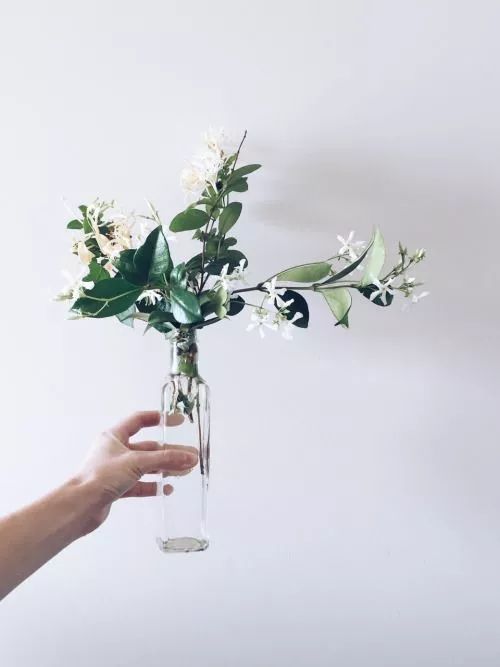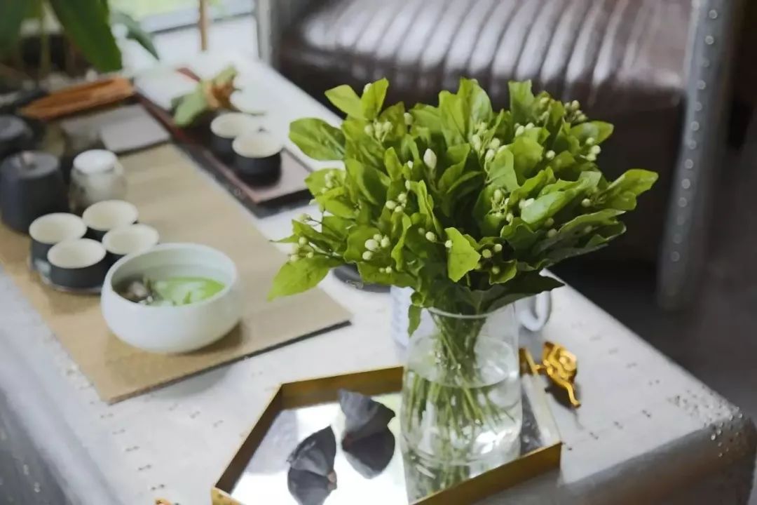茉莉花花白叶绿,花朵缠绕枝干而开,可以变换不同的插花方式,三两支围绕一起就是一幅天然的艺术品。