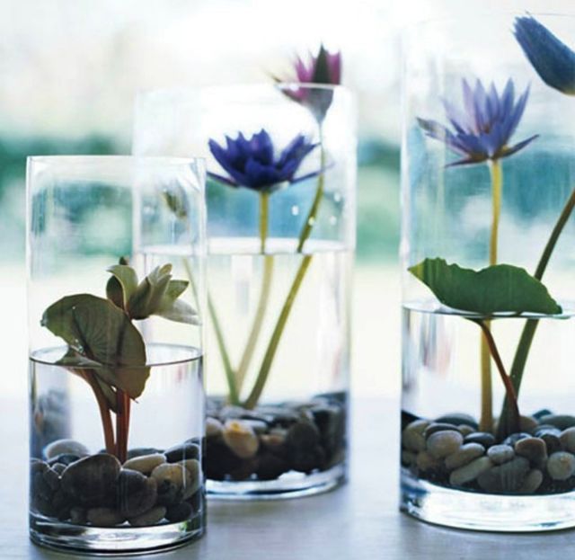 一种是大而浅的原型盆,一种是玻璃罐,荷花独立分开培养,铺上少许鹅卵石打造一个微型池塘。
