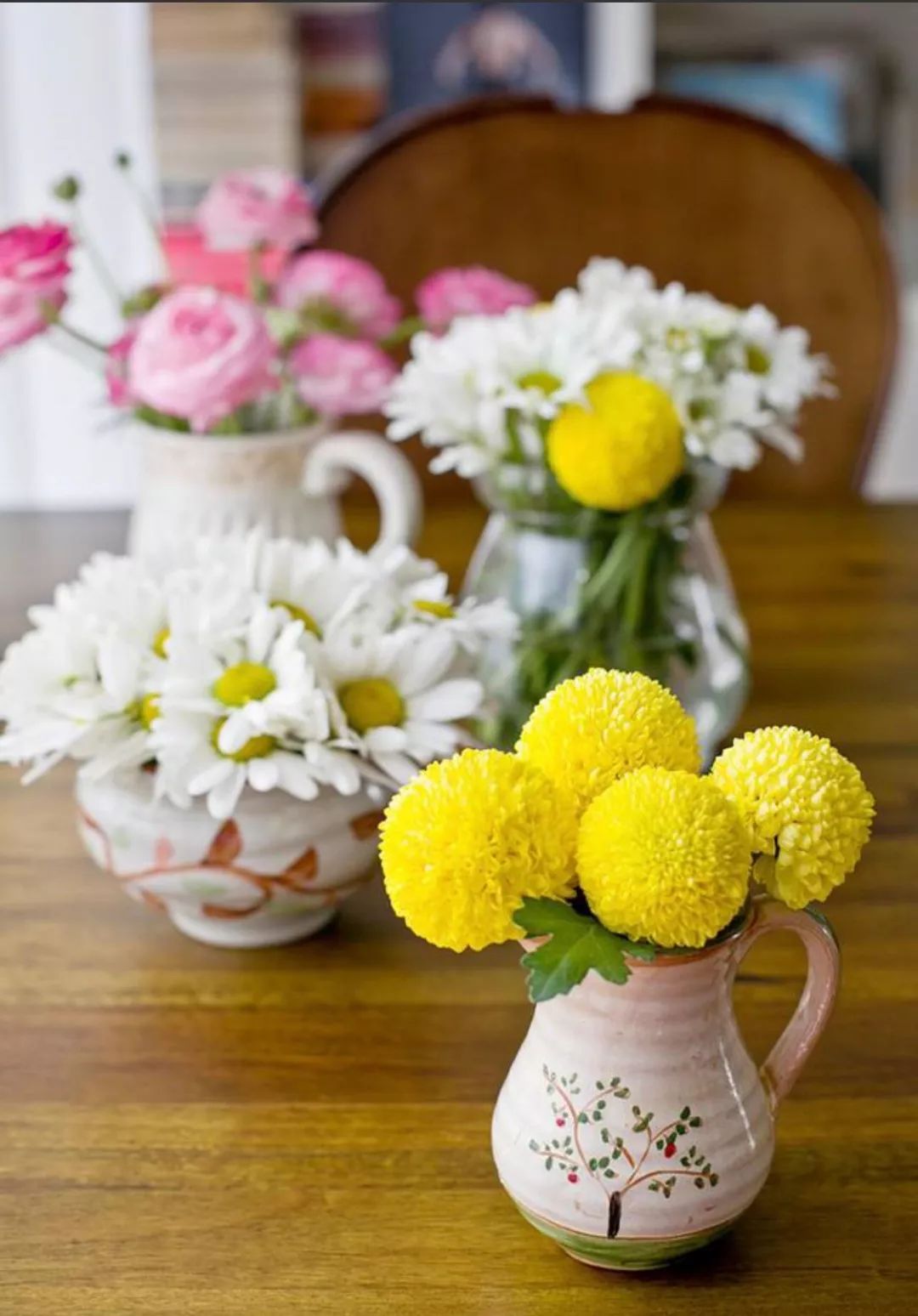 乒乓菊可以同种同色搭配,也可以用来做各种花束的配花。红色醒目、黄色提亮、绿色清新、白色百搭,圆圆的造型就很加分。
