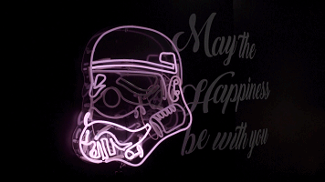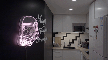 当然这并不算多么高深。他最厉害的地方在于,不是单纯的“喜欢高达摆满高达”,“喜欢变形金刚摆满变形金刚”,而是又将爱好的元素经过二次加工,结合照明的功能,变成了一个霓虹灯装饰。