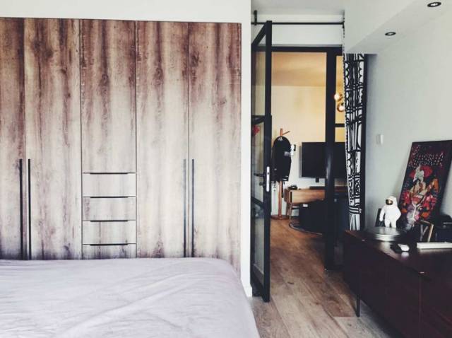 马克斯是设计师,整个家基本都是他自己设计的,格局上基本上没有动,只是把原来厨房的一部分改成了洗手间,饭厅改成了客厅。房子整体朝南,进门是洗漱区和厨房,然后是客厅,两个卧室,主卧有一个阳台。