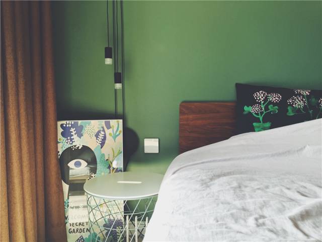 墙面是绿色的,床头布置了有储物功能的床头柜。