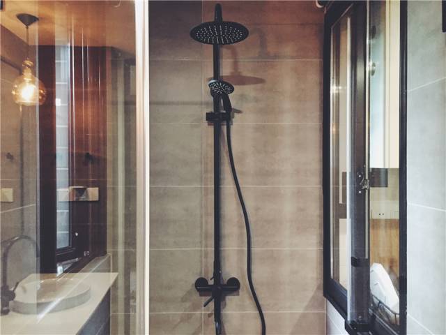 浴室用咖啡瓷砖搭配黑色五金