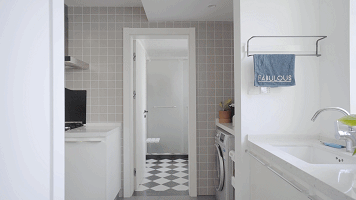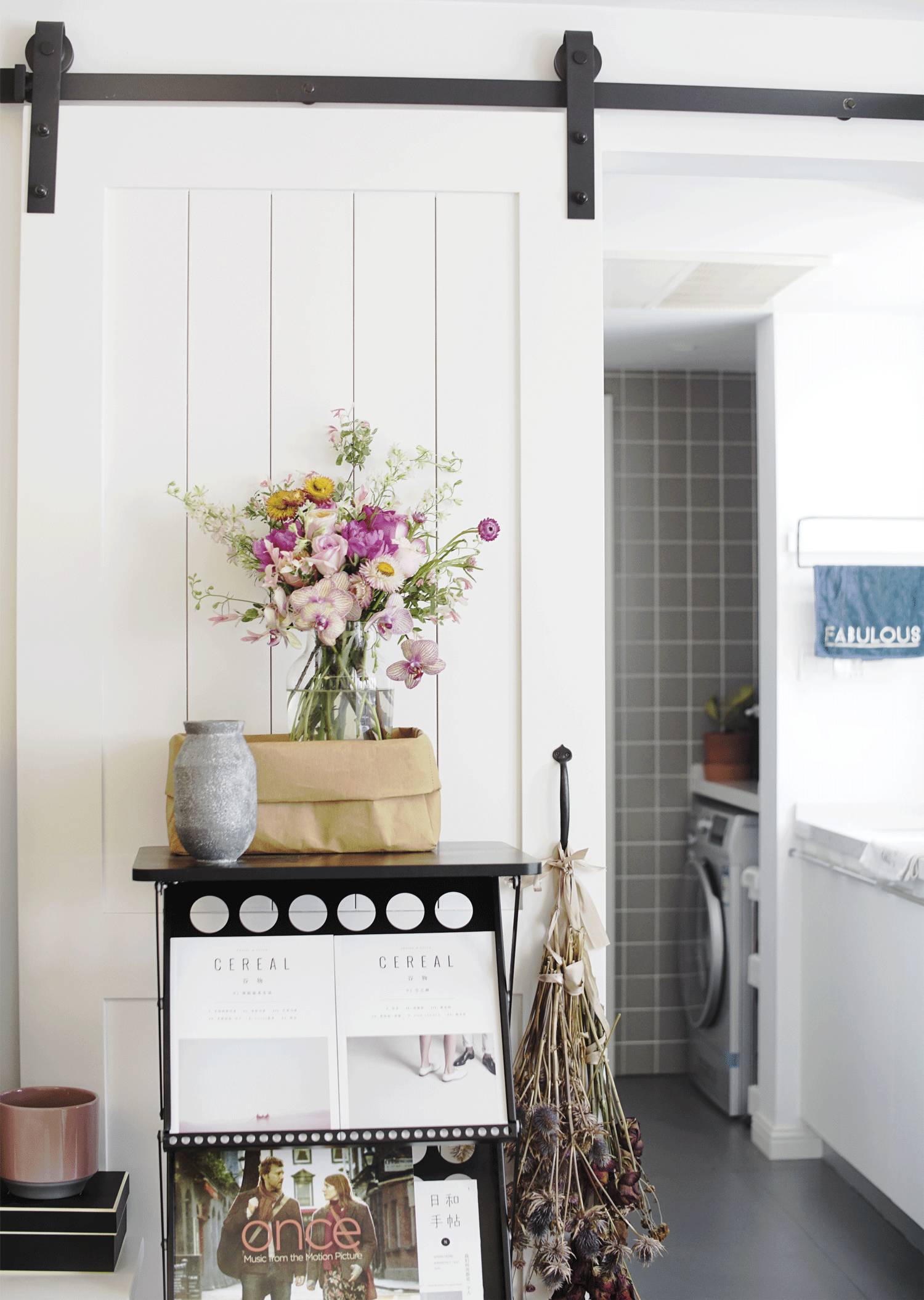 连接客厅、厨房和洗漱区做了一个谷仓门,美观又节省空间。门口的小柜子上布置一些花艺,整面墙就生动起来了。
