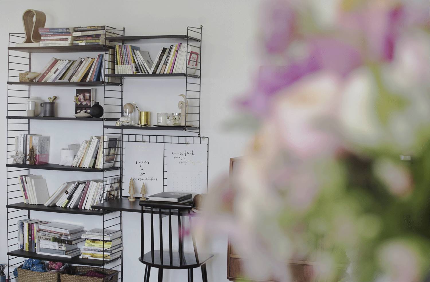 客厅的mini书房,淘了很久的丹麦中古柜,搁板桌子,干净简洁的string细铁艺书架,墙上的铁丝网是收纳和陈列的利器。