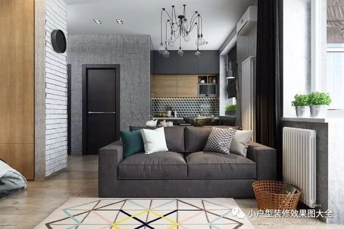这个小户型的装修风格在颜色的基调上选的是比较深的颜色,在一些设计上还有点工业风格,原始的粗犷的美。
