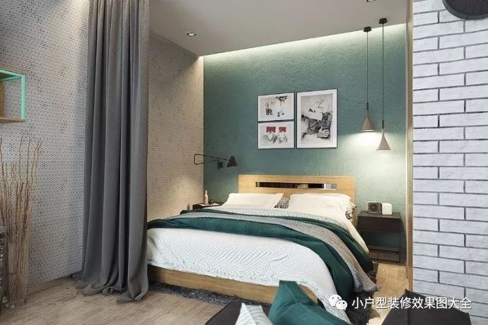 卧室的效果看起来很梦幻,灯光的衬托,蓝绿色的装饰色调,用灰色的帘子将卧室和客厅隔开,使得空间看起来不会拥挤。
