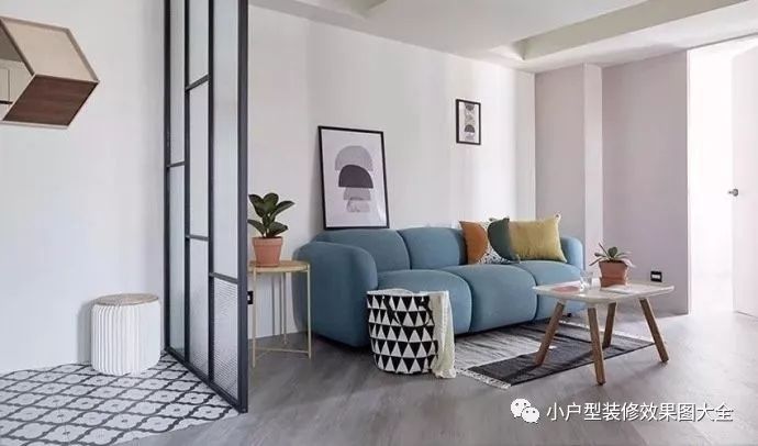进门的玄关做了一个隔断的设计,将玄关和客厅隔开,这样不会进门有种一览无余的感觉,还能增加空间的层次感。玄关的设计很简单,就是一张比较大的脚垫,一个玄关凳。