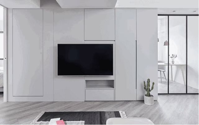 电视背景墙是一本一体的设计,整体就是一个白色的隐形橱柜,尤其是旁边就是卫生间的这种设计。