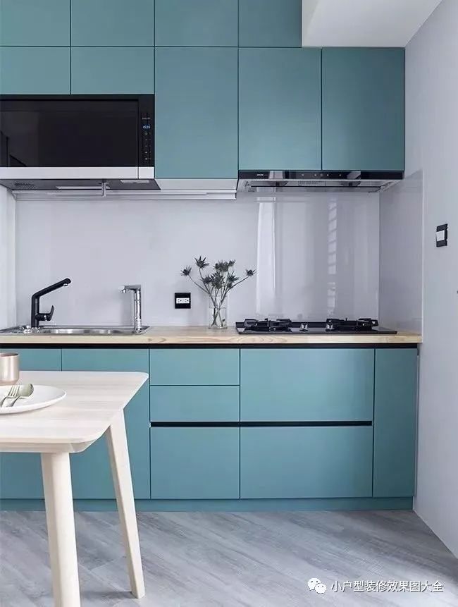 餐厅和厨房是组合在一起设计的,靠窗的设计就在玄关的右侧的尽头,将阳台和客厅的空间打通,然后改造成餐厅和厨房,客厅和阳台中间的承重墙也要加以利用变成壁龛,是不是很棒?蓝绿色的厨房用色,上下都是橱柜的设计,最厨房的局部地区进行了白色瓷砖贴合,干净易打理。
