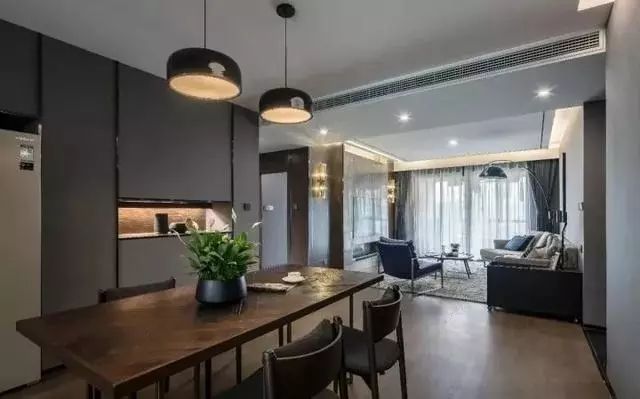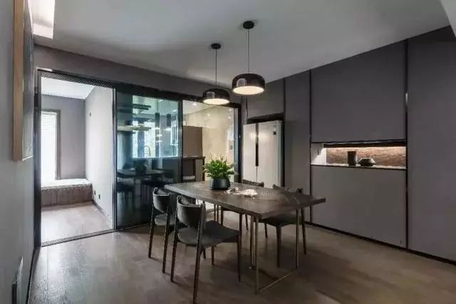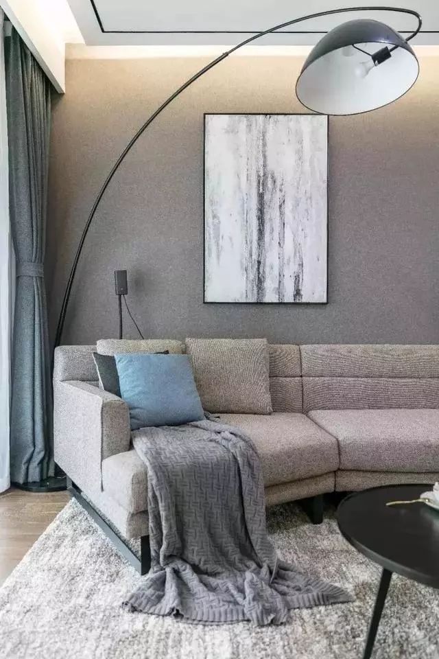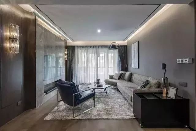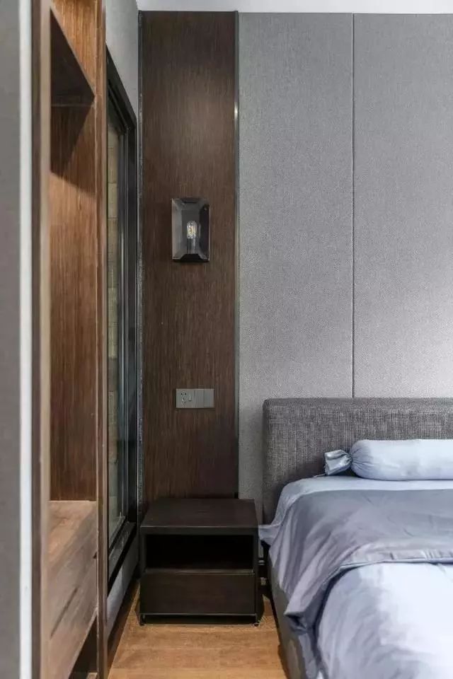 灰色虽然很迎合时代潮流动向,但是难免压抑,因此在地板、家具的选色上采用了胡桃木的颜色进行自然过渡,衔接更加美。