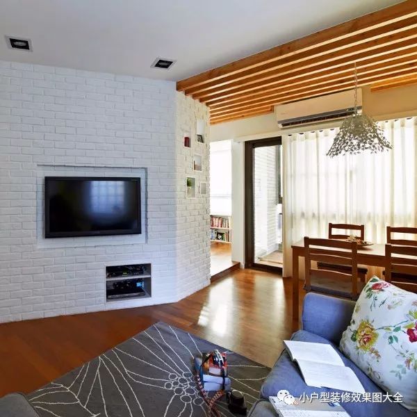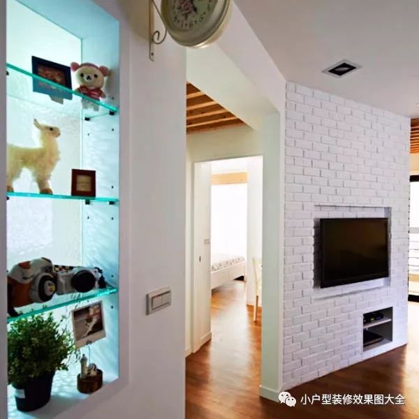 电视背景墙是这个客厅的亮点,白色墙砖打造的折角型的电视背景墙,电视和影碟机等都是内嵌在墙壁里的,还有旁边墙上摆放的一下装饰品。这样不规则形状的设计会增加空间的层次感,让空间的视觉效果看起来宽敞很多。