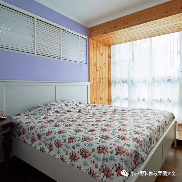电视背景墙的墙后就是卧室,简易样式的双人床,淡紫色的床头背景墙,飘窗用原木材质作了重点突出,真的是很混搭的感觉。