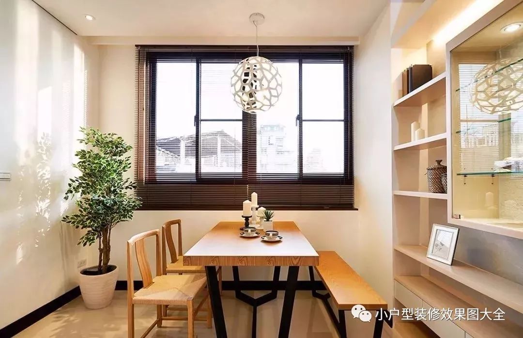 餐厅设计在了窗边,简易的原木餐桌椅,木椅和卡座样式结合的餐厅,后边还有一整面的墙高的展示架,让吃饭都是一种悠闲地享受呢!