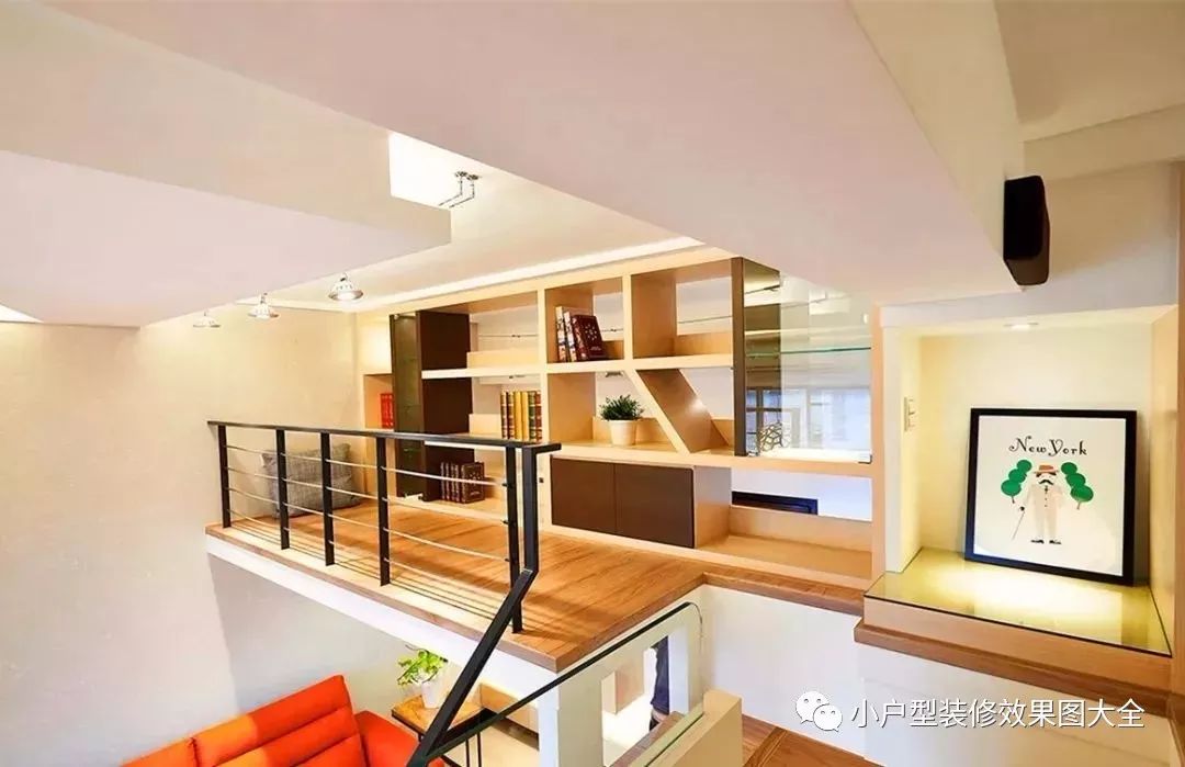 出于安全的考虑,在跃层的顶端设计了一个小空间,小背景墙上用画装饰着,灯光打在上边还是很有情调的,下方的下空间正好可以正常走路用。