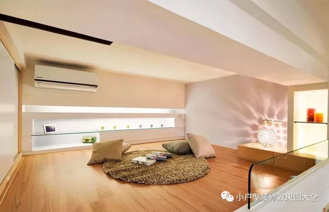跃层的顶端的右边就是一间比较大的休闲室了,精致的水晶灯散发着美美哒柔和的灯光,地上的地毯和几个抱枕真的是很有北欧风的唯美感,旁边的墙上还有一个隐形的推拉门的橱柜,也是很实用的设计。