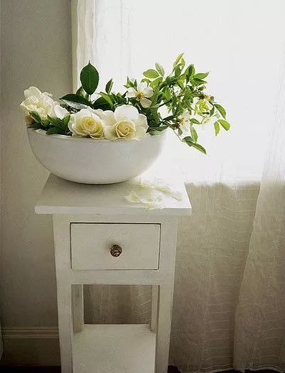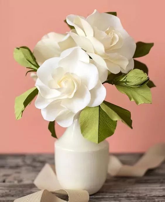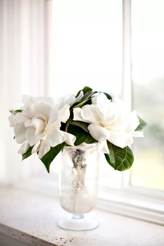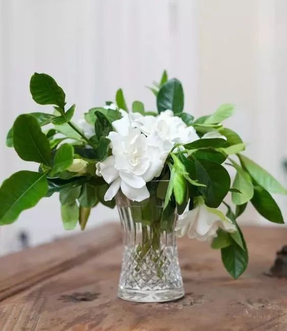 淡雅的栀子花适合纯色的花器,也不适合和别的花材混插,less is more。