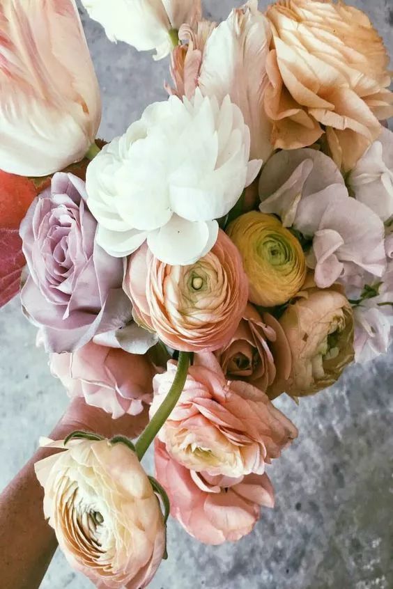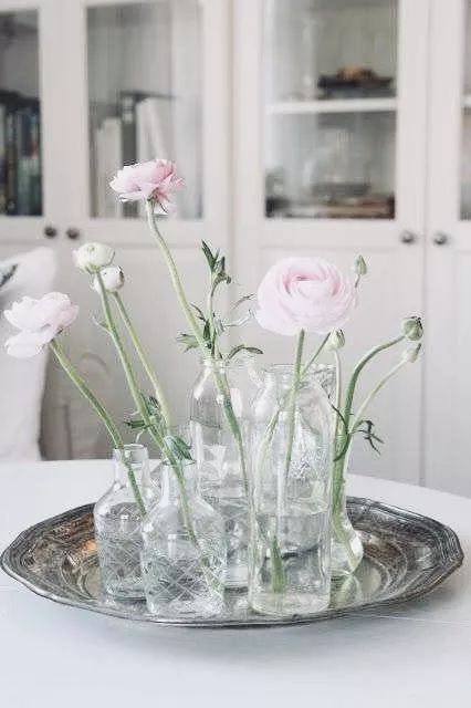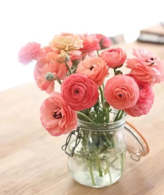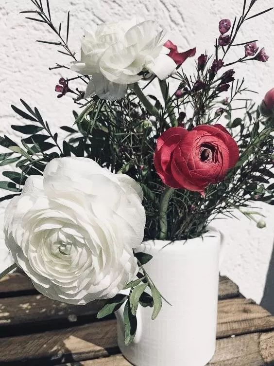 花毛茛适合和别的花材搭配装点,颜色上会有层次递进的效果。如果你喜欢简单的搭配,也可以插入玻璃瓶中,一瓶一朵,温柔又含蓄。