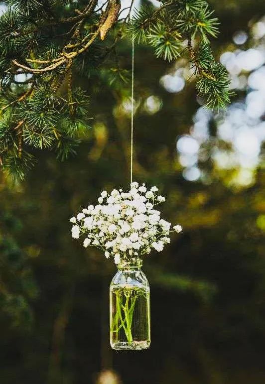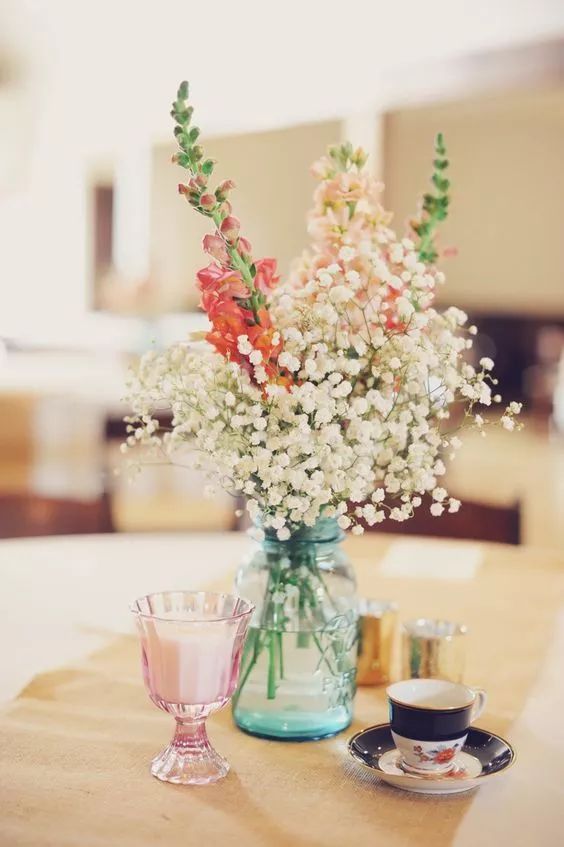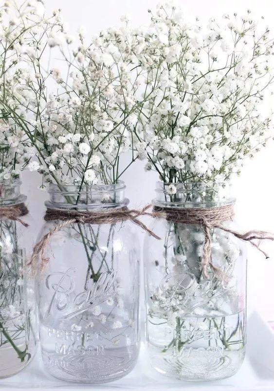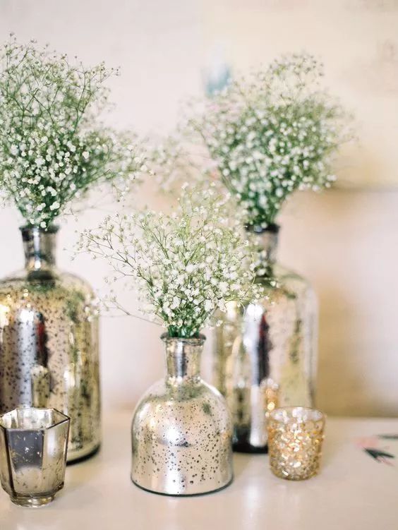 满天星适合盛放在窄口玻璃瓶内,添加一两枝主花颜色更丰富。我很喜欢右边这组搭配银色花器的满天星,宁静又有时髦感!